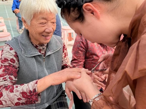 物資表心意,服務(wù)更暖心?;顒?dòng)現(xiàn)場(chǎng)專(zhuān)門(mén)設(shè)置了公益理發(fā)、健康義診、推拿服務(wù)等志愿項(xiàng)目,由醫(yī)生和志愿者們?yōu)槔先颂峁┵N心服務(wù),現(xiàn)場(chǎng)氣氛溫馨而有序。87歲的章秋玉老人家在推拿醫(yī)生按完肩頸后,紅了眼眶:“年年都想著我們,真是和家里人一樣親。”?